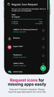 Open our app and click on the Request card. Check all icons you want to be themed and send requests by pressing the Floating Send button. You will get a share screen with options on how to share requests, and you need to choose Gmail (some other mail clients like Spark, etc., have problems attaching the zip file, which is the most important part of the email). When sending an email, DO NOT delete generated zip file or change the Subject and text in the body of the email – if you do that, your request will become unusable!