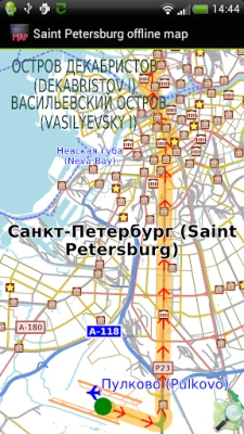 Offline map of the Russian city of Saint Petersburg, (formerly Leningrad), for non-Russian tourist & business visitors. Download before you go and avoid expensive roaming charges. The map runs completely on your device; map, routing, search, bookmark, everything. It does not use your data connection at all. Switch your phone function off if you want to!